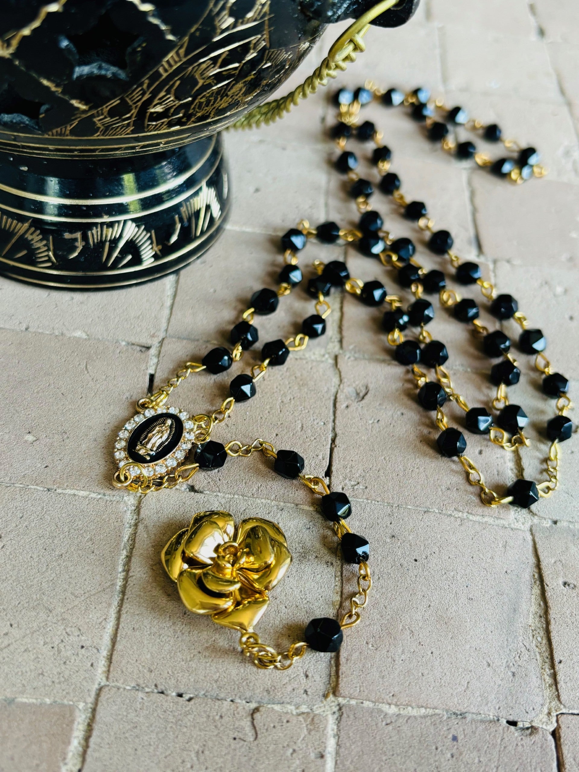 Composé de perles d'Agate noire, pierre d'ancrage, de protection et de stabilité intérieure. Orné d'un médaillon de la Vierge Noire, il incarne la puissance du féminin enraciné et lumineux dans l'ombre.